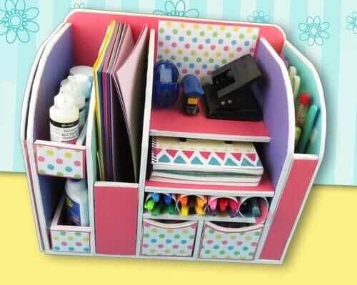 Los organizadores de escritorios son muy útiles para guardar lápices, clip, etc. Antes que nada debes cortar las piezas de tu organizador (puede ser 6 piezas de 28,5 cm x 23 cm y una larga de 8 cm x 23 cm). Usa un cartón pluma grueso para que sea resistente. Apóyate en la cola blanca o la pistola de silicón para unir sus partes. También puedes pintarlo y adornarlo como quieras.