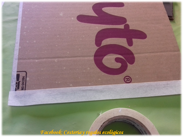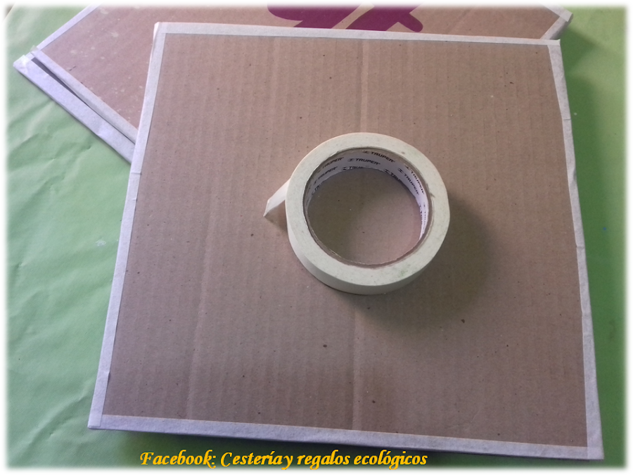 Pegamos de dos en dos las piezas de cartón, así tendremos 3 piezas. Las orillas de cada pieza las forramos con cinta de papel o cinta de carrocero...