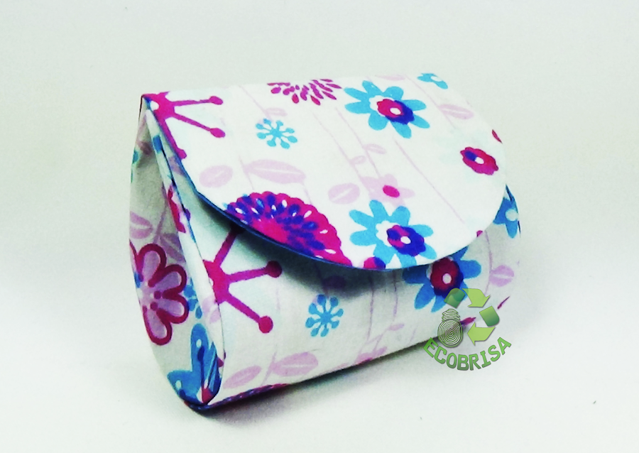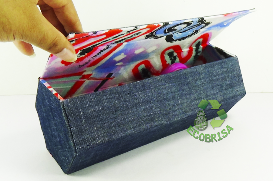 - Pegamos los hexágonos de papel en los laterales del neceser, y la tela sobrante la pegamos en el cuerpo del neceser con cola blanca