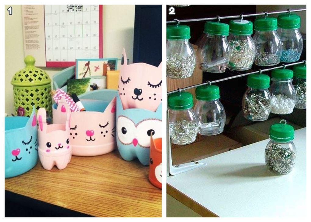Para mamá o para las jovencitas de la casa puede resultar una idea interesante sacar provecho de los botes vacíos de shampoo, cremas corporales y otros artículos de uso personal. Lo ideal en estos casos es escoger los botes con formas más bonitas y colores intensos y hasta con transparencias, para darle a las manualidades un toque bastante original. Cuando estén listos, podrán disfrutar de sus obras de arte en estantes, en el tocador del baño y hasta en su mesa peinadora.