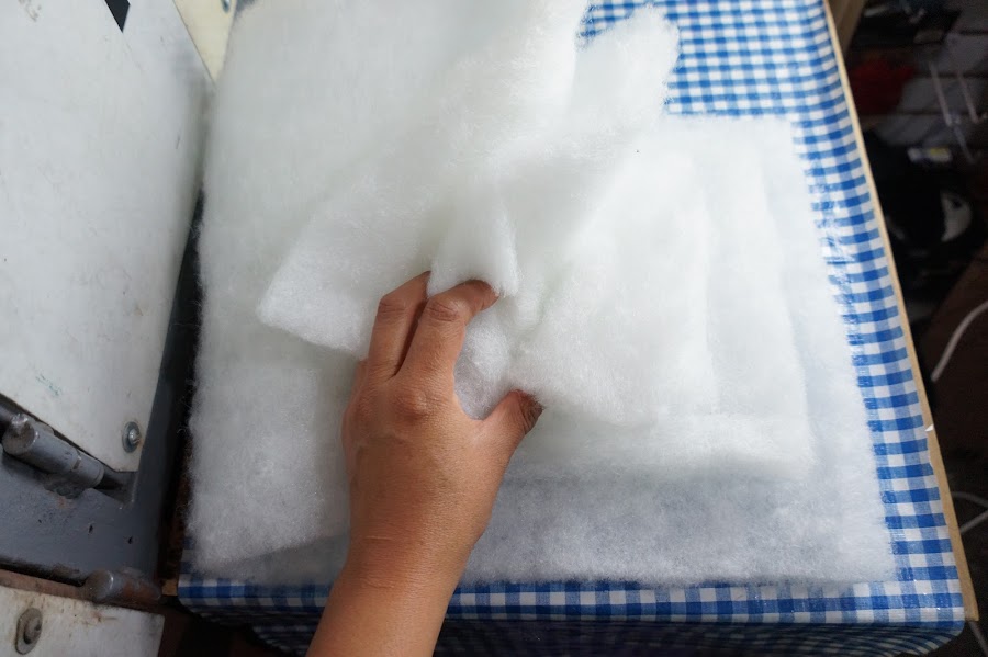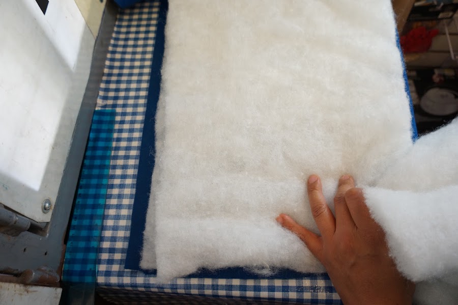 Ahora doblaremos la guata a la mitad y cortaremos 3 piezas cada una medirá la primera 40 x 30 cm, la segunda 35 x 25 cm, la tercera 30 x 20 cm, recuerda que estamos cortando con la guata doblada para que de un lado no se corte y se pueda extender al doble