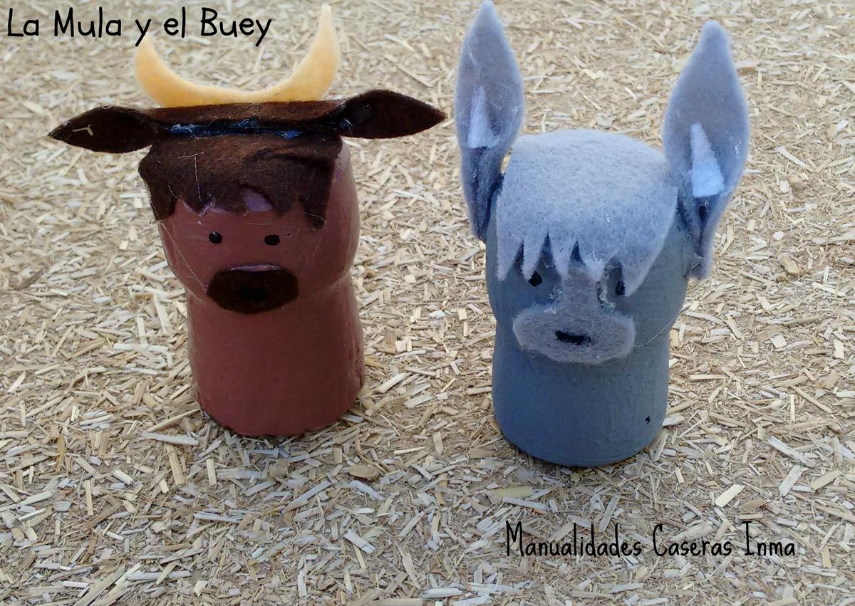 Con dos tapones esta vez de cava para que se diferencia el cabeza del cuerpo , pintamos la mula de gris y el buey de marrón, con fieltro les hacemos orejas, los cuernos y el hocico, siguiendo la foto es fácil de hacer, los pegamos con silicona caliente. Una vez pagado les pintamos los ojos y una ralla el hocico.