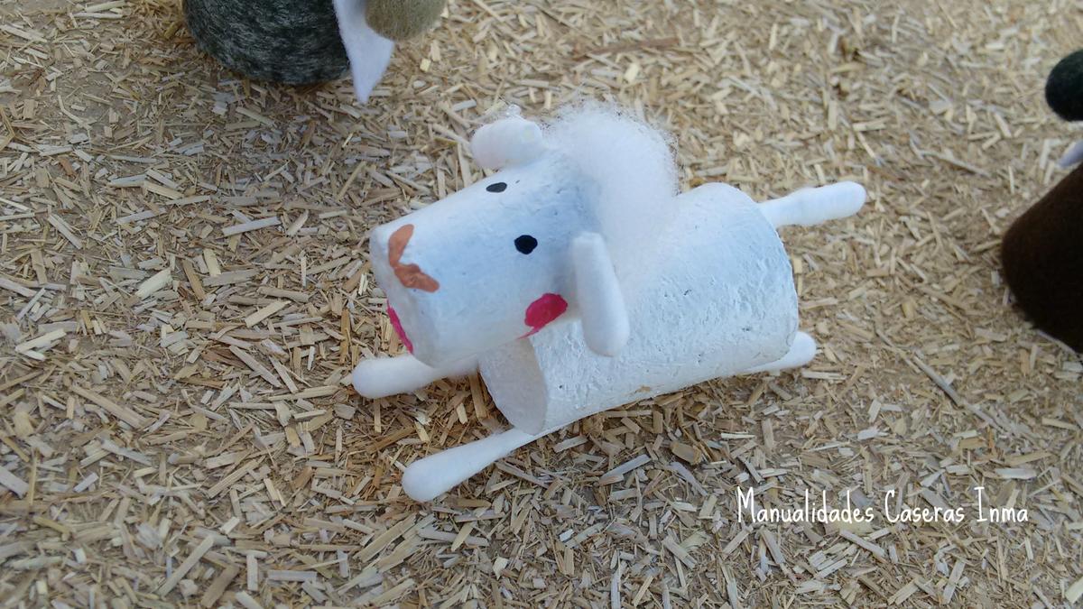 Para realizar la oveja he cogido dos tapones en este caso con forma cónica uno de ellos lo he cortado quedándome con la parte más fina que será la cabeza de la oveja y el otro será el cuerpo quedando la zona más gruesa detrás. Unimos con un trozo de palillo y pegamos con silicona caliente, pintamos de blanco todo, dejamos secar y pintamos el cabeza. Con 4 bastoncillo hacemos las orejas, las patas y la cola. Pegamos algodón en la cabeza y ya tenemos nuestra oveja.