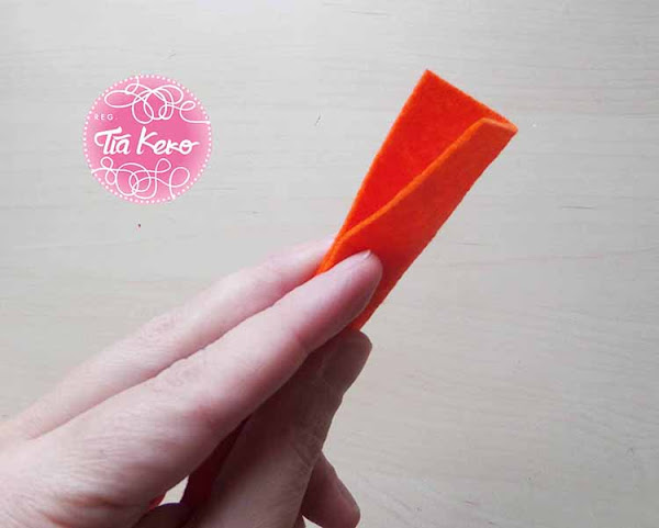 Una vez tenemos las tres tiras de fieltro cortadas, vamos a comenzar a hacer las flores. Lo primero que haremos será doblar por la mitad una de las tiras, igual que en la imagen inferior,