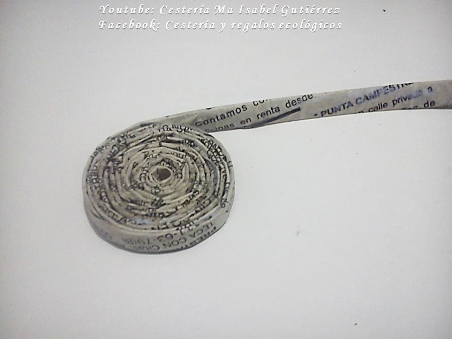 Cortamos tiras de papel, pueden ser de diarios o de revistas o folletos, con un ancho de aproximadamente 10 cms. De largo lo que mida el papel. Ponemos pegamento o cola blanca a lo largo de toda una orilla, y empezamos a enrollar con el palillo por la otra orilla, acomodando el palillo un tanto inclinado como se ve en la imagen, el enrollado no debe ser muy apretado, ya que necesitamos las varillas de papel un poco bofas para luego, con nuestras manos, aplanarlas...