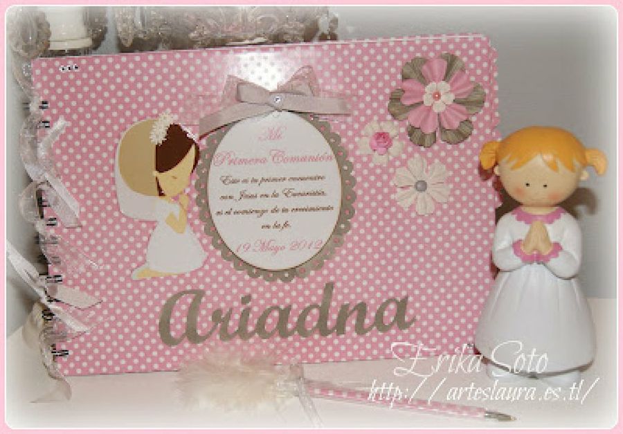 Otra manualidad muy similar y también básica es el libro de firmas. Se puede elaborar de manera similar, con láminas de papel para las hojas interiores y dos tapas duras como portada y contraportada. En lugar de ir grapado o anillado, un bonito resultado es cosiéndolo o perforando el lateral y atando lazos de colores.Una muestra es el álbum diseñado por la usuaria Elenarts. Dispone de una gran decoración llevada a cabo con troqueladora y sellos en forma de flores y corazones. También tienen pequeños abalorios que simulan ser perlas y colgantes metálicos de ángeles y cruces, muy apropiados para este festejo.