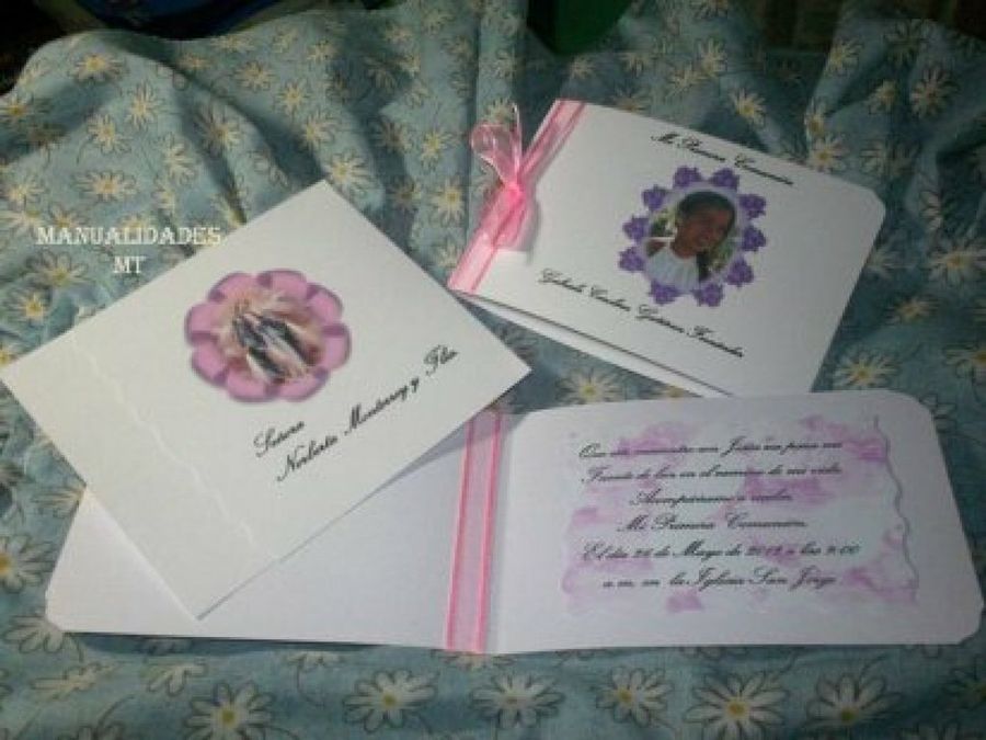Uno de objetos más comunes y fáciles de elaborar son las postales que se enviarán por correo para asistir al compromiso. De hecho, con cartulina y algo de imaginación crearemos una obra de arte. Pueden ser decoradas en una gran variedad de formas, con fotografías de nuestro hijo, estampas religiosas, lazos, etc.La usuaria Tejina ha fabricado este bello modelo en blanco con una cinta rosa en uno de los laterales. En el centro, ha dibujado unos pétalos y ha incluido la cara de la protagonista en medio. Una vez abierto, veremos los datos más destacados, como la fecha, el nombre y apellidos de la joven y la dirección.