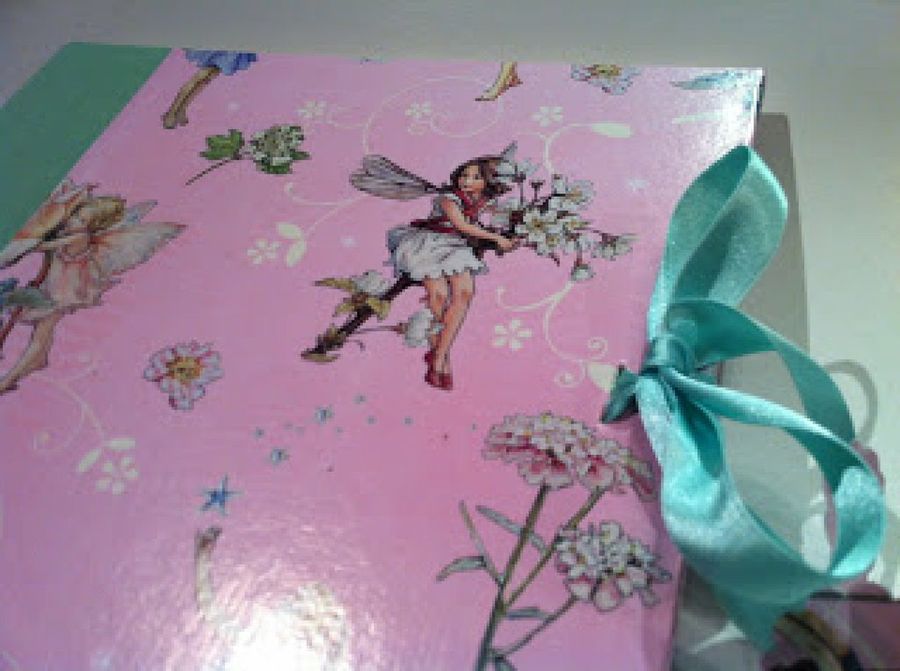 La amiga CartonnageCurra ha fabricado esta hermosa carpeta que bien puede servir como álbum de fotos. Tiene un tamaño de 23x23 centímetros y ha sido forrada enteramente con papel rosa, cuyas imágenes son de hadas y flores. Como cierre le ha colocado una enorme cinta turquesa en el lado derecho.