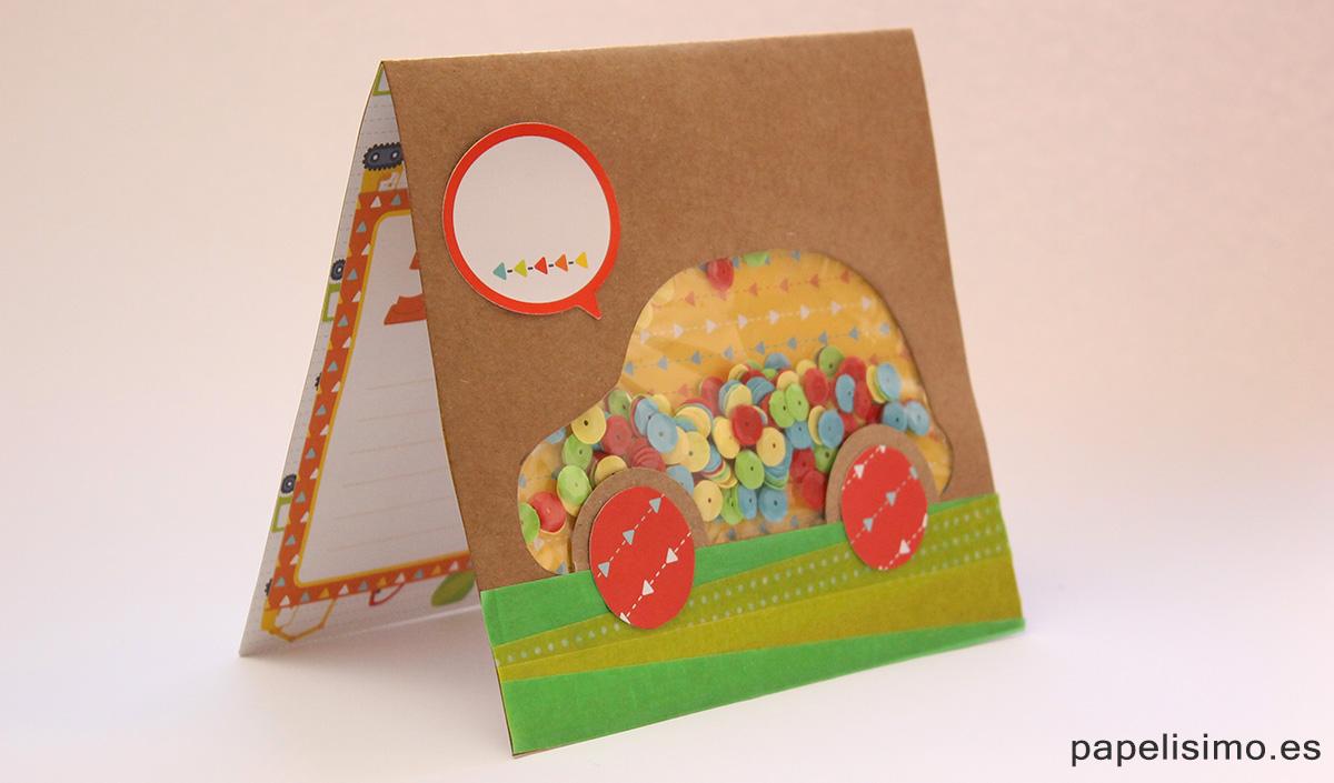 Una tarjeta muy original para los padres a los que le gustan los coches. Puedes hacer esta tarjeta “shaker” (agitadora) rellenando con piezas pequeñas sueltas que al agitar la tarjeta se mueven.