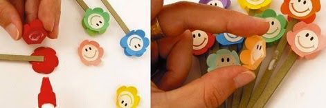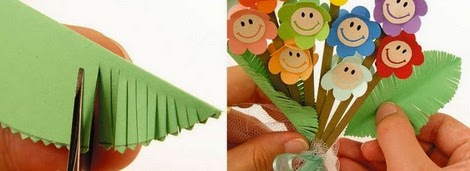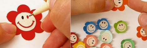 Luego pegar encima de la flor las caritas de papel, y con un plumón pintar los ojos de negro, para que resalten.