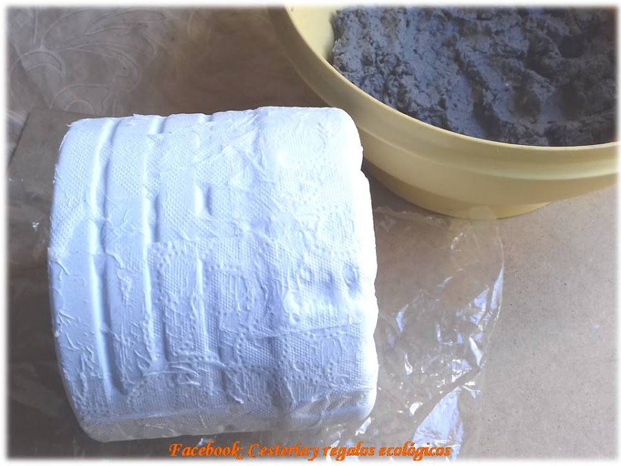 Forramos la parte de afuera del recipiente con pedazos de papel higiénico o servilletas de papel, lo hacemos con una mezcla aguada de pegamento o cola blanca común y un poco de agua...