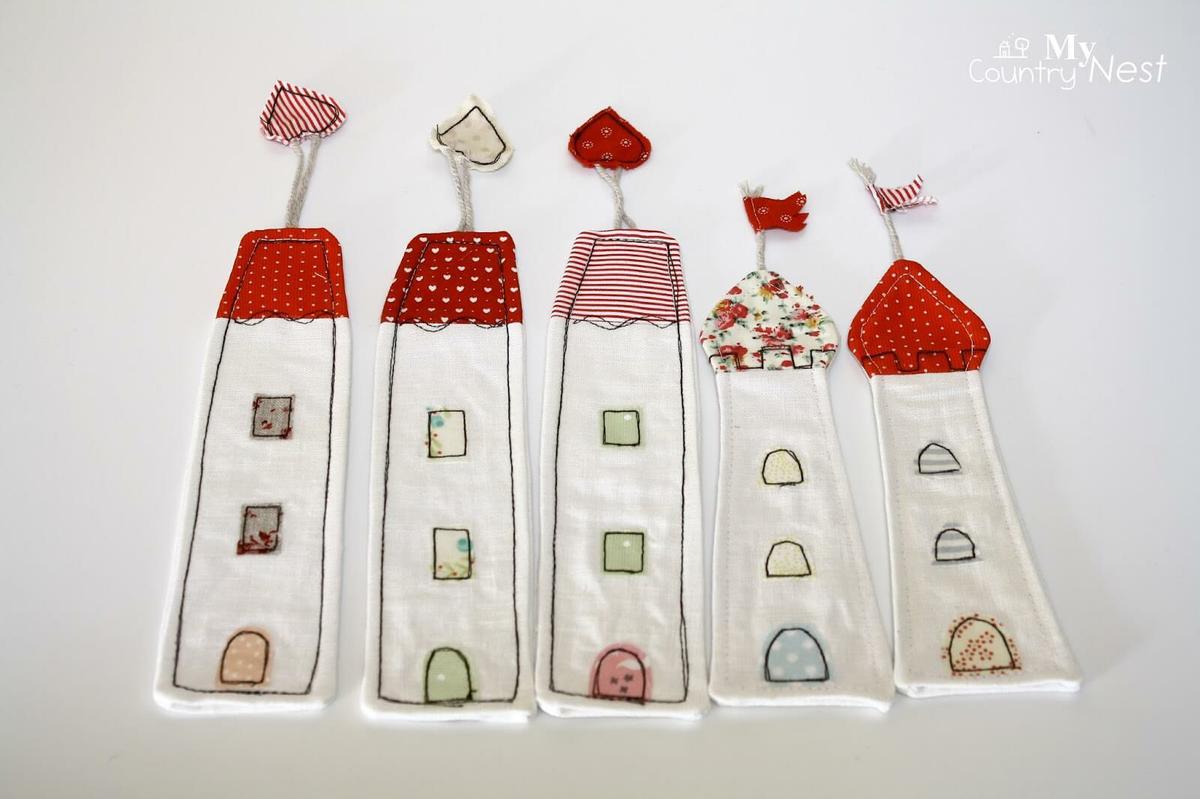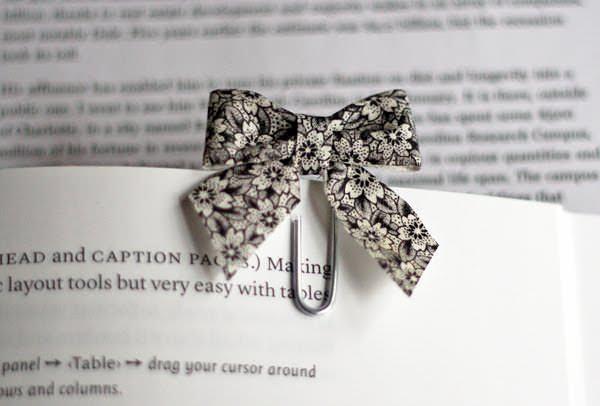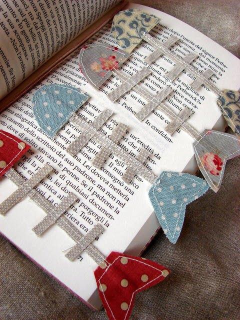 Otra idea genial para poder aprovechar hasta el retal más pequeño es utilizarlos para hacer marca páginas. Puedes coser unos originales puntos de libro en forma de raspas de pescado, con forma de casitas o simplemente hacer un lazo sobre un clip metálico.Vía: Shabby home
