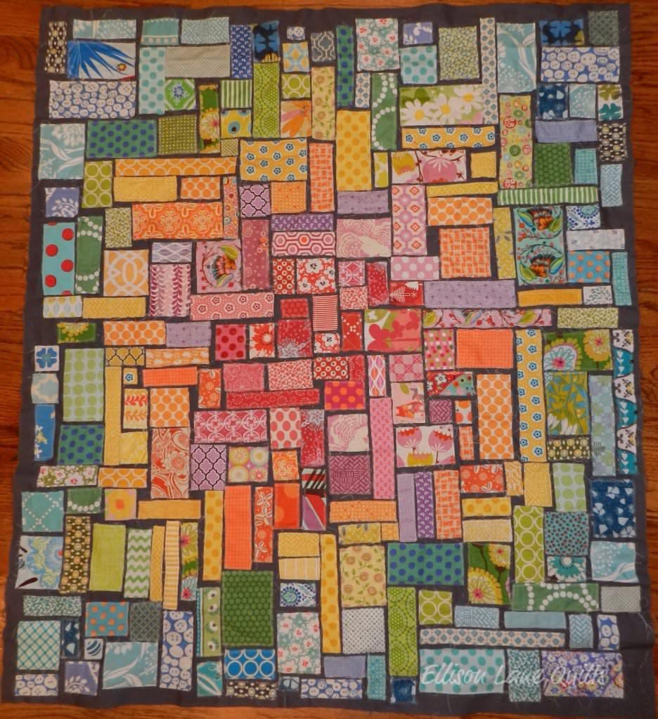 Y si tienes muchos retales y algo de paciencia, puedes realizar esta estupenda colcha. Para hacerla sólo tienes que ir colocando los retales rectangulares sobre una tela grande como si fuera un rompecabezas. Aunque parece que los retales no tienen ningún orden, si te fijas se han colocado los colores cálidos (rojos, naranjas y amarillos) en el centro de la colcha y los colores fríos (verdes y azules) en las esquinas.
