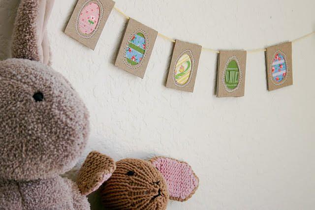 Hace tiempo que las guirnaldas se han incorporado a la decoración y podemos encontrarlas en cualquier espacio interior o exterior, evocando un ambiente festivo y aportando un toque de informalidad. Quedan preciosas como decoración en las habitaciones infantiles.Aunque esta guirnalda se ha realizado para celebrar la fiesta de pascua, la idea de mostrar diferentes retales a través de un recorte realizado en un trozo de cartón me ha parecido muy original. Puedes recortar en los cartones formas redondas, cuadradas, de estrella…