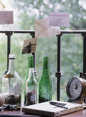 Limpia bien la botella y quita la etiqueta, después puedes optar por pintarla o mantener su color de origen. En el fondo coloca piedras para que sostenga el alambre. Dobla el alambre en una de sus puntas en forma de espiral para que puedas sostener notas o fotos.