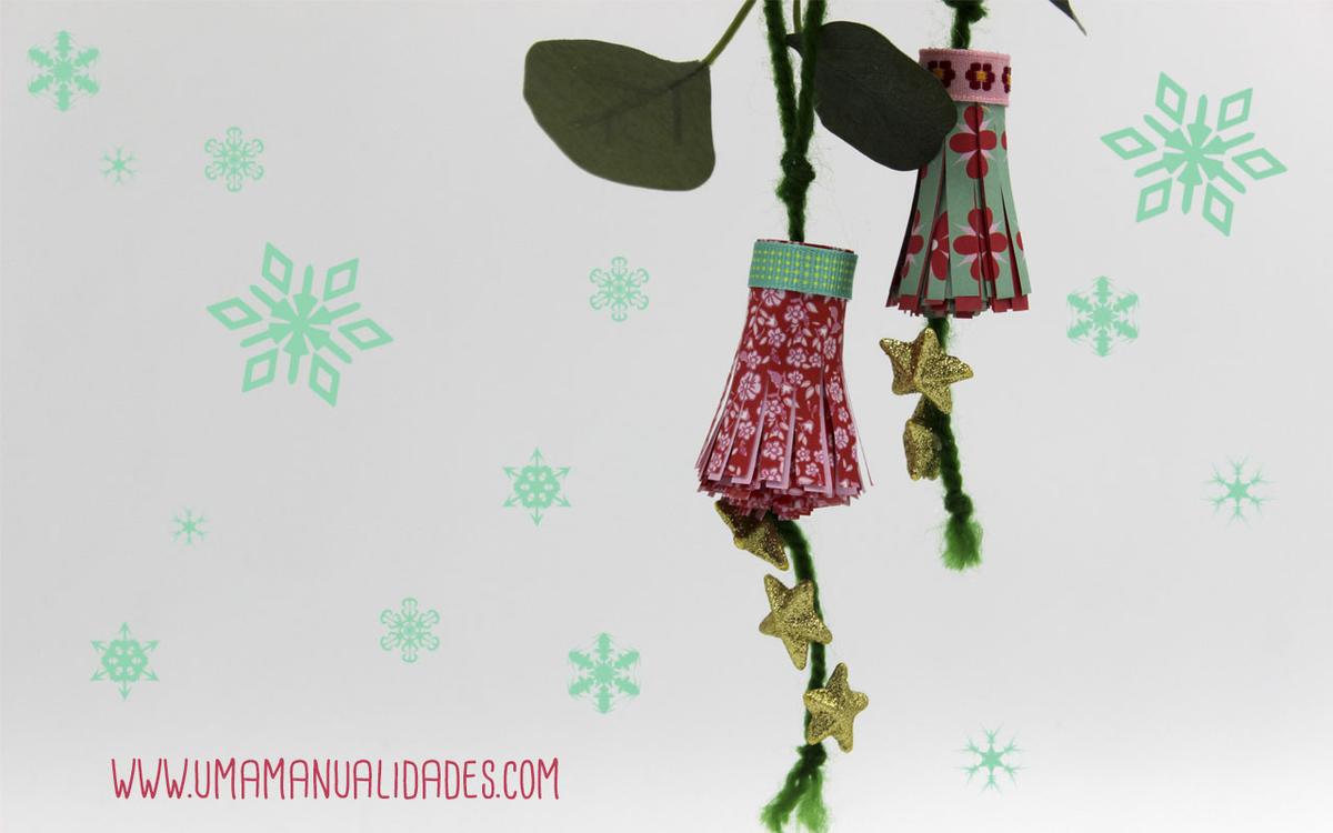 Éstos otros adornos también de papel son otra buena opción incluso para combinar con la anterior. Las borlas de papel son muy rápidas de hacer y podemos jugar con los estampados de los papeles y las cintas para crear piezas únicas.