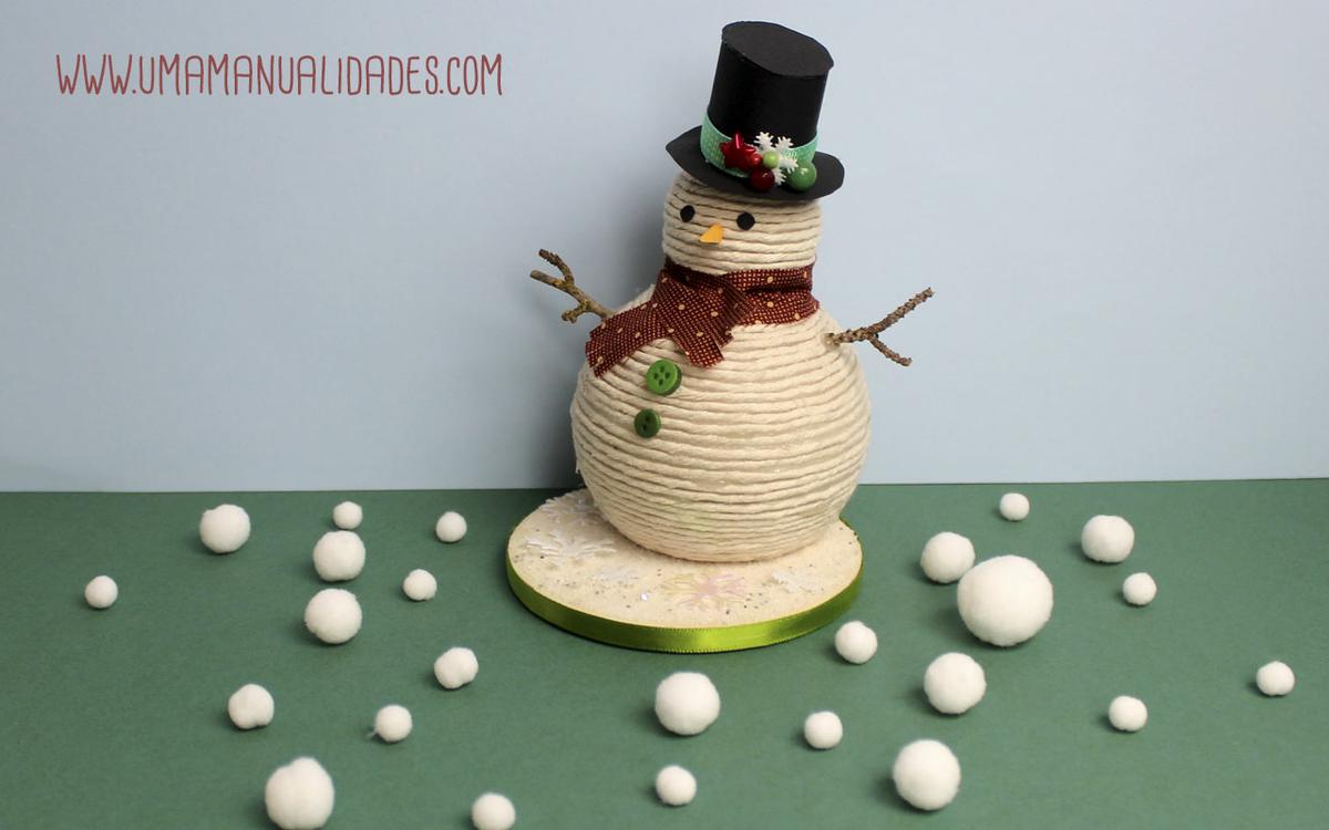 Otros adornos de Navidad muy bonitos y sencillos que podemos hacer son las figuritas para decorar como por ejemplo éste simpático muñeco de nieve realizado a partir de unas bolas de porexpan cubiertas de cuerda de algodón y decoradas . Éste proyecto es muy fácil de realizar y el resultado es genial.