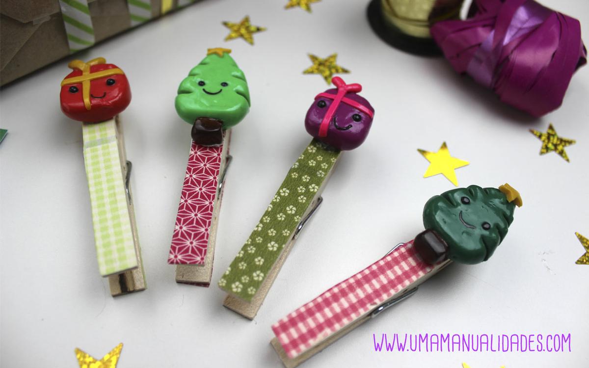 Para adornar regalitos y paquetes, podemos pensar en otras manualidades y DIY creativos como por ejemplo éstas pinzitas con motivos Navideños de Fimo que te ayudarán a adornar tus regalitos con un toque único y muy especial: