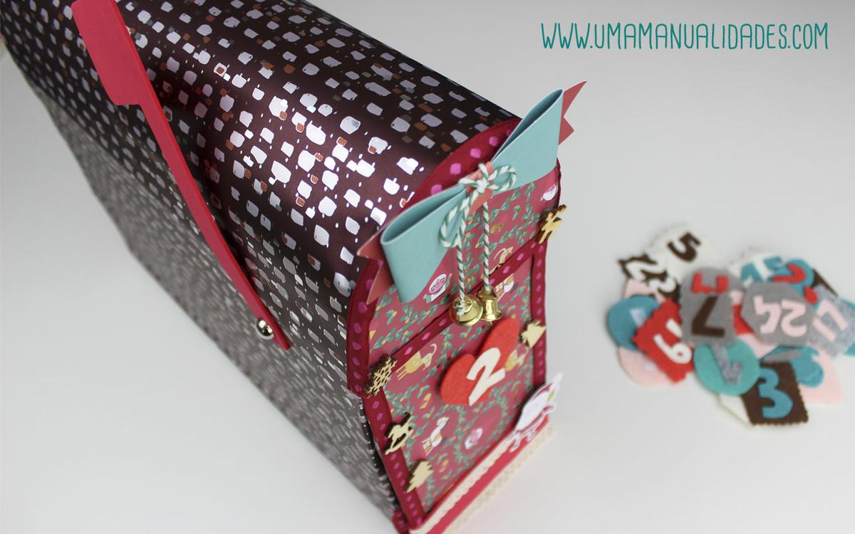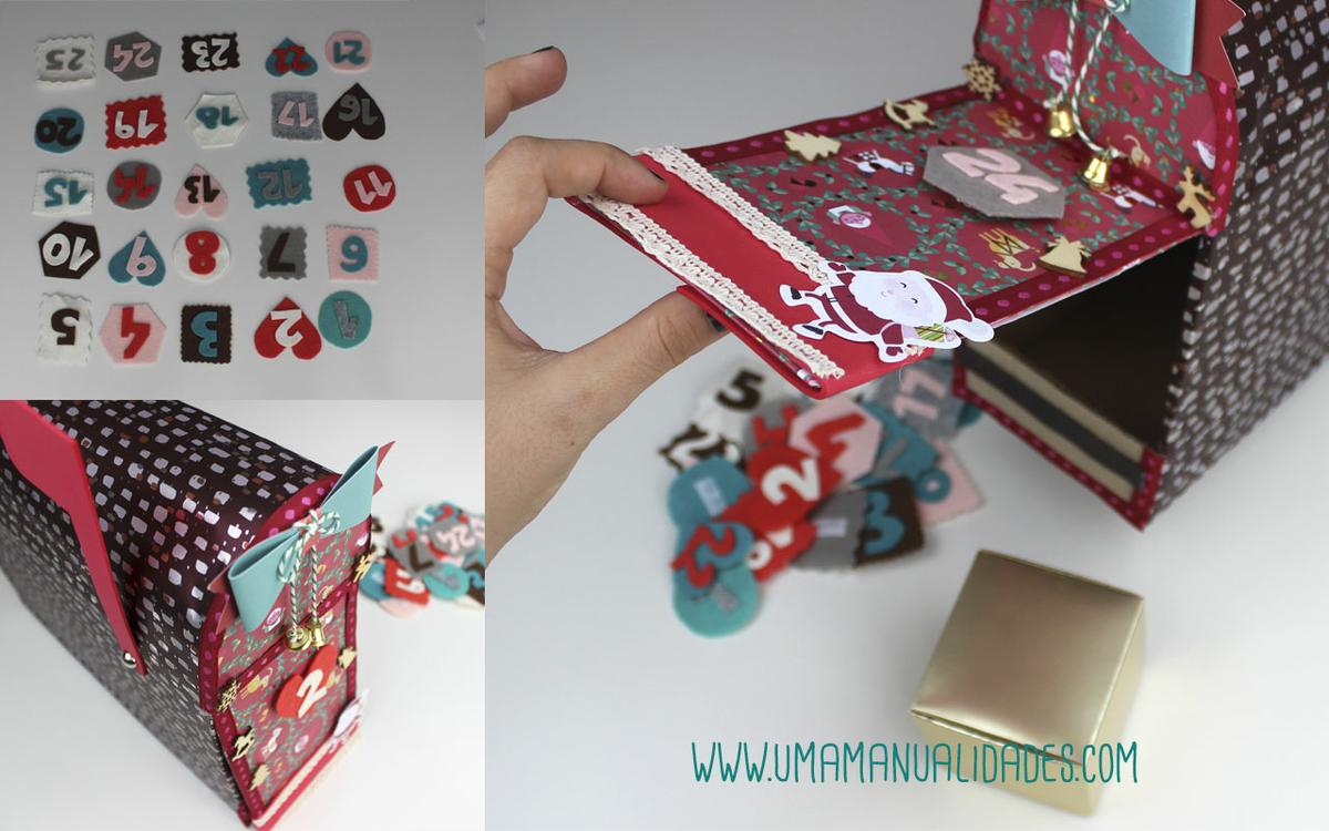 Lo más divertido es que podemos bajar y subir la palanca roja para indicar cuando está lleno o vacío por lo que como se tiene que actualizar diariamente no hay tentaciones ¡de abrir antes de tiempo! el misterio y la diversión están asegurados con éste original calendario de adviento echo de cartón ¿No os parece?
