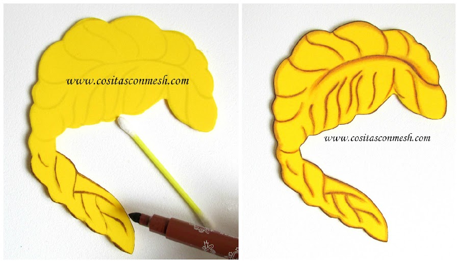Con plumón marrón delineamos las hebras del cabello, y con un hisopo difuminamos suavemente.