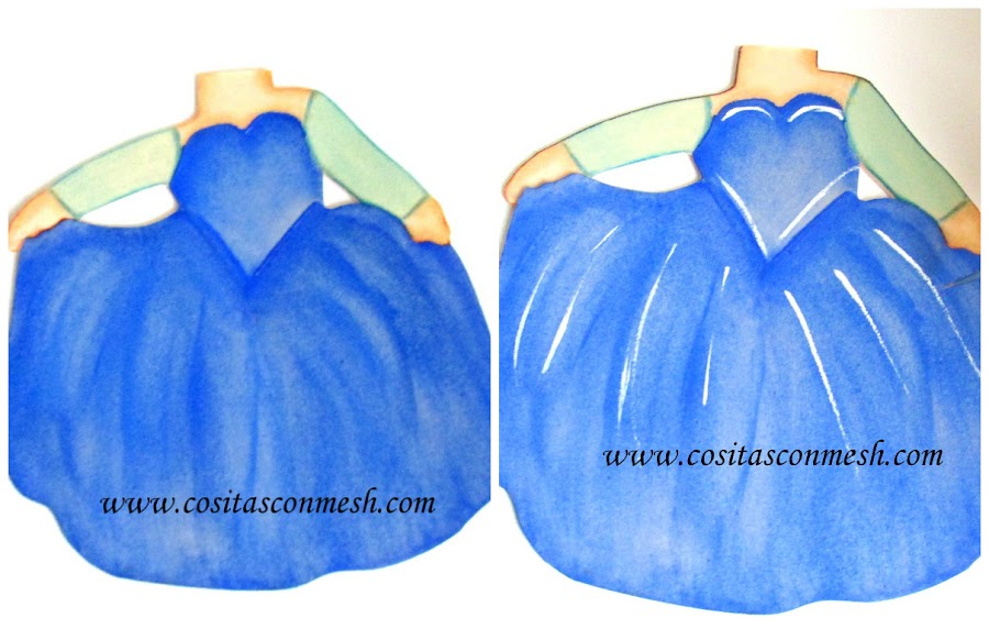 4.-Así quedara el vestido todo pintadito, por último con pincel linner y pintura blanca, pintamos lineas en blanco para darle algo de luz al vestido.