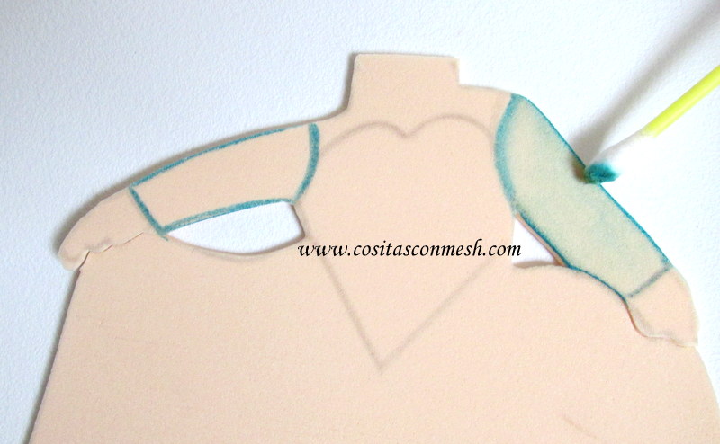 3.-Esta es la parte que más me gusta, pintamos de azul el vestido, usa un pincel de pelo suave, y pinta en una sola dirección, el foami absorbe rápido la pintura, te aconsejo cargar con mucha pintura, luego arrastrar el pincel hacia la parte inferior del vestido, algunas zonas del vestido puedes dejarlo más clarito.