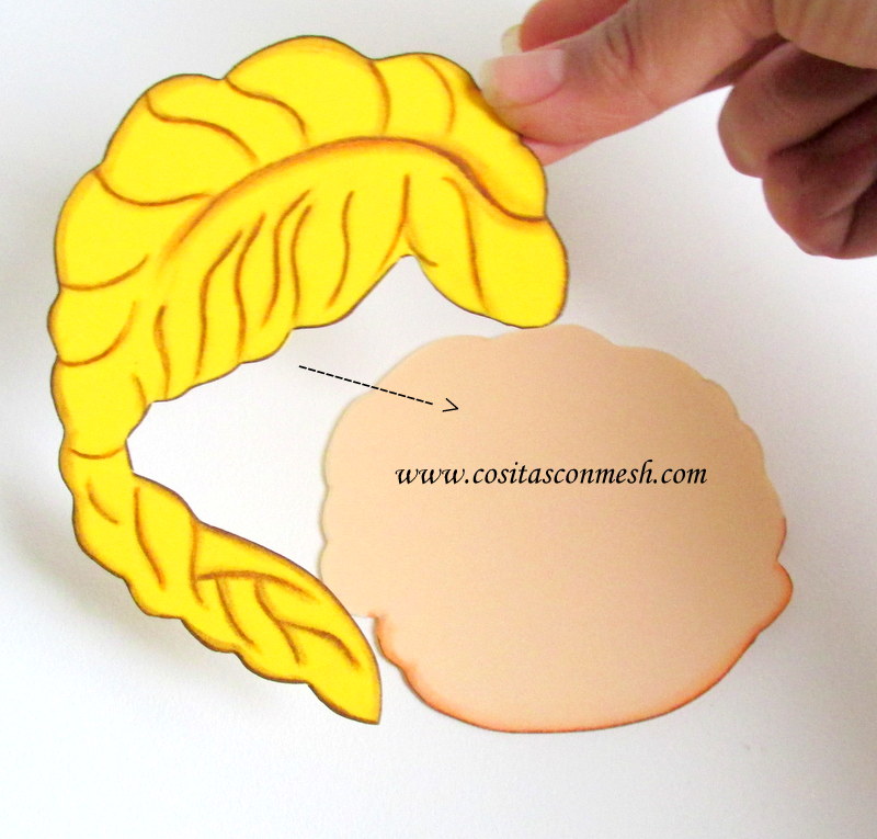 6.-Así quedara el cabello de nuestra figura, ahora lo pegaremos con silicón liquido, poniéndolo encima de la carita, dejando las orejitas por fuera.