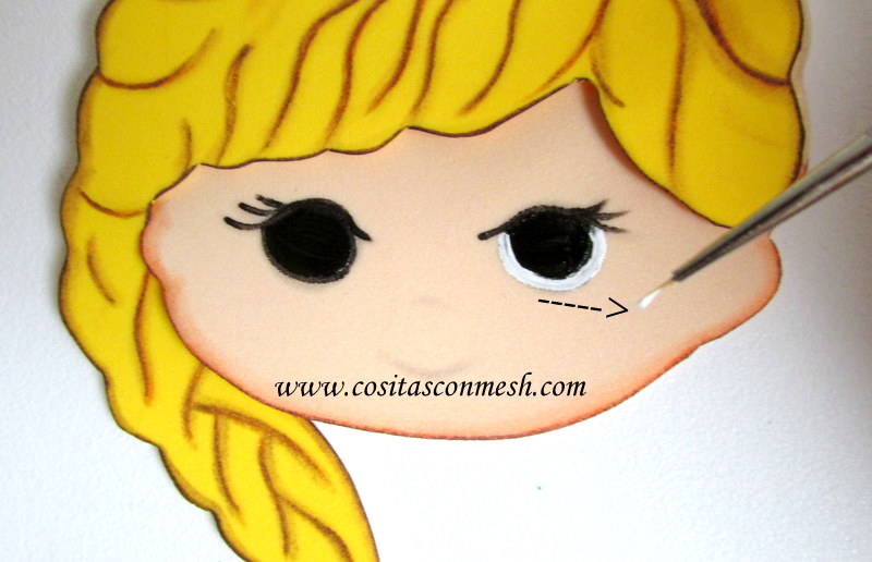 9.-Para termina de pintar los ojos, pintamos puntitos blancos en el ojo, pueden ser 1, 2 o 3, luego con el mismo pincel linner, delineamos el ojo.