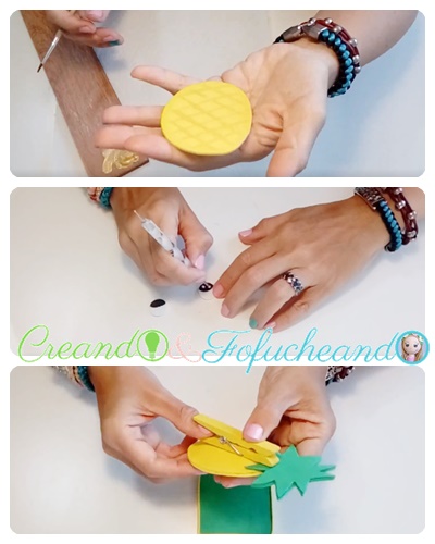 Pegaremos las hojas y el borde del cuerpecito, y meteremos un poquito de relleno pa que le nuestra piña quede asentada e interesante, jajaja.