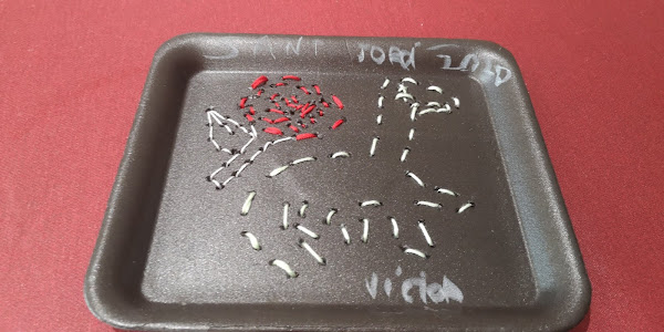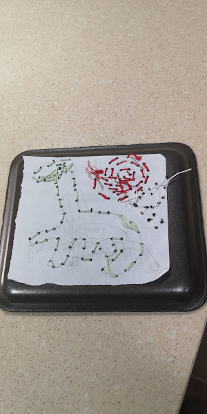 Mi grande hizo con una bandeja de poliexpan de estas de la verdura, hilo, papel y aguja un dibujo de Sant Jordi