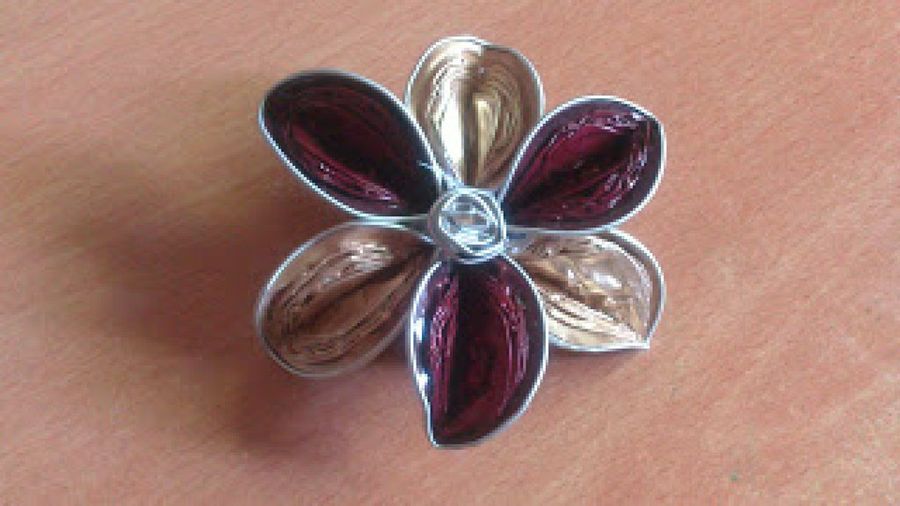 La amiga MargaritaQ ha diseñado una hermosa flor con diferentes colores. Primero escogemos un par de tonalidades y las entrelazamos. A continuación, las aplastamos hasta dejarlas lisas y las apretamos desde los lados. Por último, con pegamento las unimos y le añadimos un adorno en el centro.