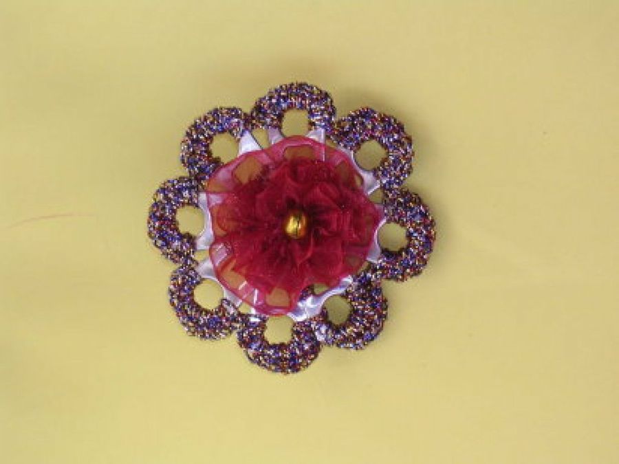 Otra posibilidad es hacer un magnífico broche para llevar en el suéter. En esta ocasión, recubrimos la parte exterior con tela del tono escogido. En el centro, a modo de flor, fijaremos sedas transparentes y un alfiler de cabeza redonda para sujetarlo. También podemos añadir un poco de silicona. Esta ha sido la idea de la amiga Novalina.