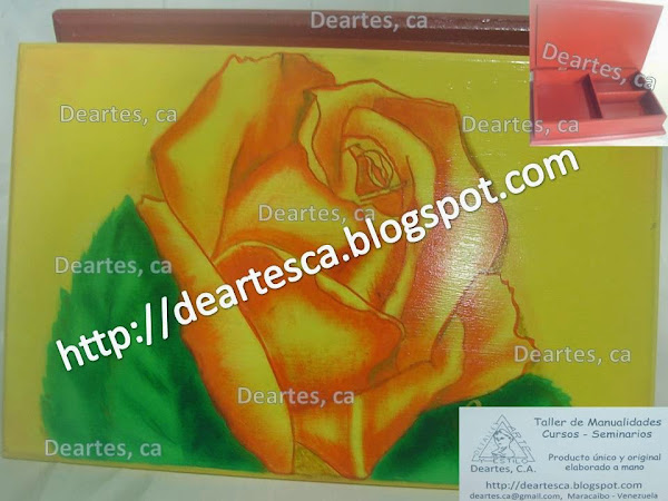 Este cofre está todo pintado con Rojo indigo, la tapa tiene fondo amarillo y utilizando la técnica de Pintura Decorativa tiene una linda Rosa Naranja con tonos amarillo pálido.
