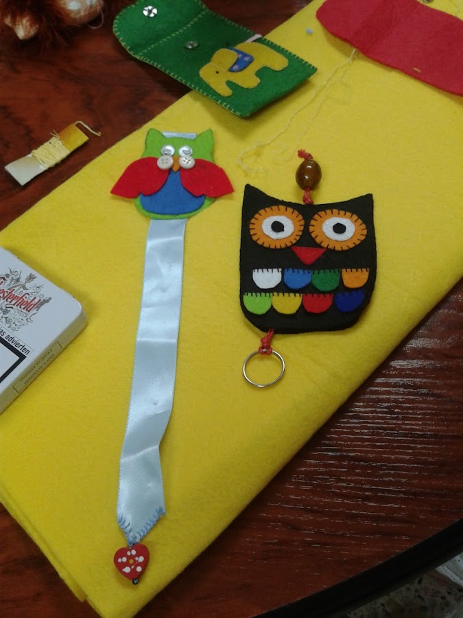 Un llavero y un marca paginas con forma de búhos, y una funda para el móvil con un elefante , todo de fieltro.