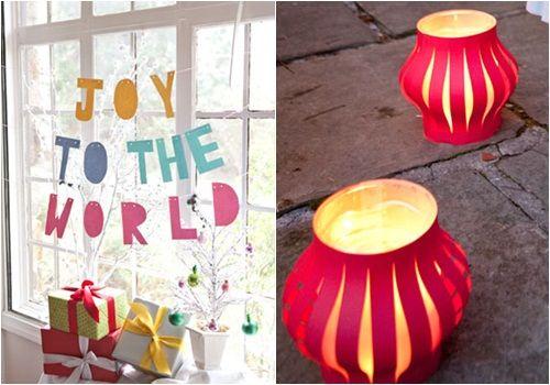 Desea felicidad al mundo con esta guirnalda de cartulina en la que puedes poner un mensaje como Feliz Navidad, Paz y Felicidad u otra frase sencilla que te guste. También puedes hacer estos faroles de Navidad con jarrones de cristal grueso o con botellas de plástico de refresco de dos litros. Sólo tienes que cortarles el cuello y ya tienes recipiente para poner alrededor el diseño en cartulina o plástico flexible.