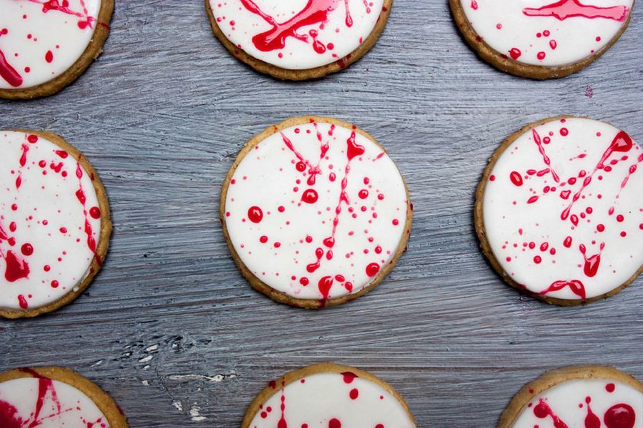 Y ya por último, no podía faltar una receta fácil para niños para este día. Podemos hacer unas riquísimas galletas de mantequilla (o las que a ti más te gusten) y decorarlas para la ocasión. Necesitaremos fondant blanco, azucar glass y colorante alimentario rojo para decorarlas con gotitas de sangre. Mira el paso a paso de como se hace en el blog The cooking lab.
