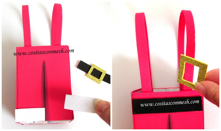 5.-Ahora decoramos nuestra bolsita con los detalles que tiene el pantalón de santa, puedes usar foami diamantado en color dorado y blanco para que se vea más bonito. Pega el cinturón hecho en foami negro y dorado, el dobladillo del pantalón es en foami blanco.
