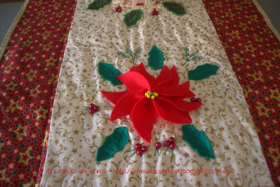 Está hecho de patchwork y las poinsettias las ha hecho de fieltro. Le ha cosido unas boiltas de abalorio de color granate y unas hojas verdes.