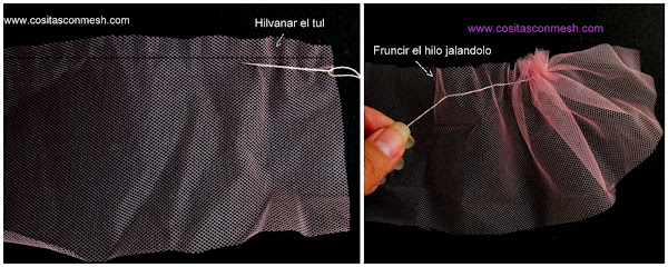 4.-Ahora corta tul color rosa 57 cm x 9 cm, con aguja e hilo blanco o rosa, hilvana en todo el largo dejando 1 cm de separación.