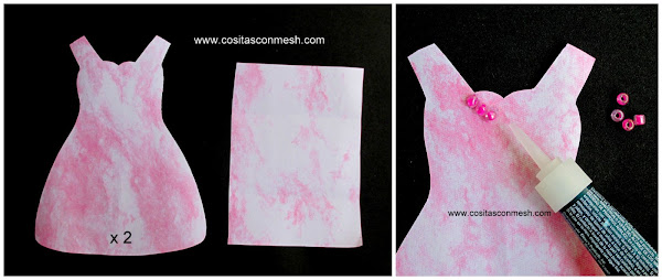 9.-Ahora que tenemos la base ya doblada, pegamos el vestido a cada lado de la base( puedes usar cinta doble o pegamento en barra)