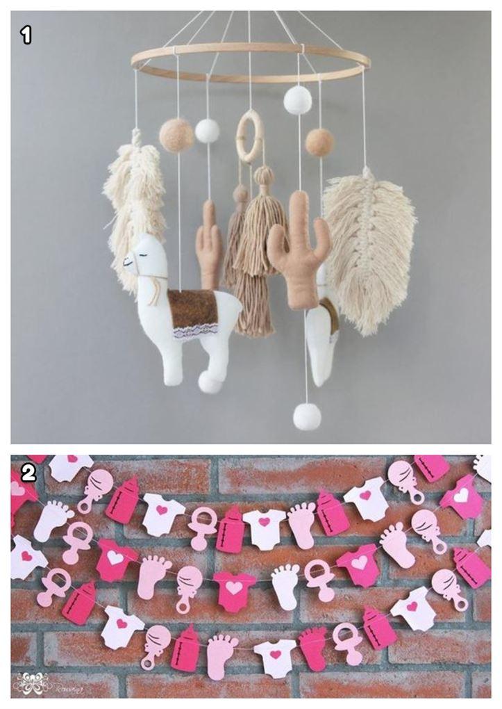 Los primeros accesorios del bebé siempre son escogidos por mamá a su gusto; por eso, dependiendo del gusto de ella es posible elaborar algunas guirnaldas que sean el atractivo central del baby shower y se puedan retirar luego para instalarse en la habitación del bebé. Te dejamos a continuación, un modelo que será tu inspiración para elaborar esa guirnalda que le encante a la futura madre.3 https://www.pinterest.es/pin/22799541852401569/