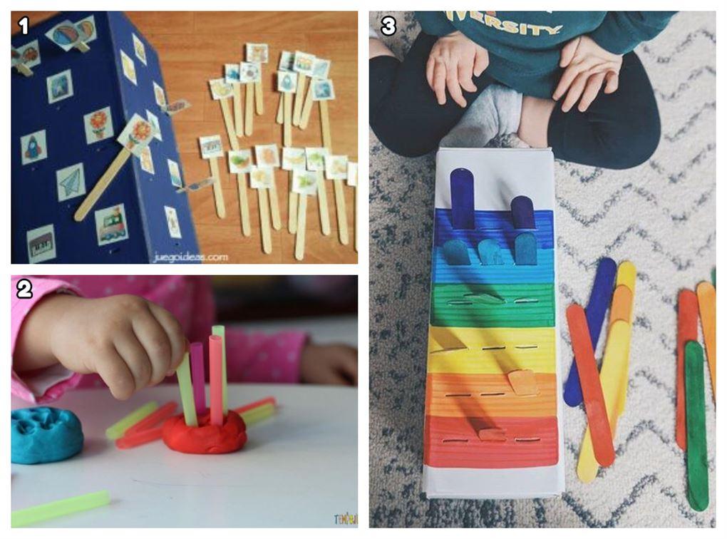 Con palitos de helado y un par de materiales más podrás poner en manos de tus pequeños un mar de ventajas. Puedes enseñarle sobre similitud entre figuras, invitarles a registrar en su cerebro la sensación de traspasar una bolita de arcilla o plastilina con un palito de helado y a diferenciar colores si pintas los palitos de forma colorida para que los inserte en las ranuras de una caja como la que verás a continuación.2 https://www.pinterest.es/pin/92886811054172560/