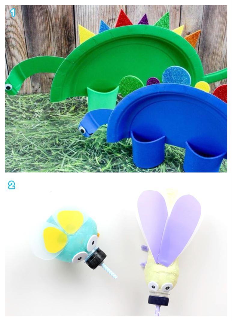 Si tu bebé ya aprendió a tomar sus bebidas con pajita, puedes elaborar para él este sencillo insecto brillante. Solo debes sellarlo bien al colocar la pajita dentro de la tapa para evitar derrames.La mejor parte es que podrás enjuagarlo para que tu bebé lo use varias veces o crear para él cada vez más insectos distintos y divertidos. ¡Son muy sencillos de elaborar y los materiales súper sencillo de ubicar en casa! Podrán jugar con su divertido dinosaurio hecho con platos mientras disfrutan su bebida favorita.