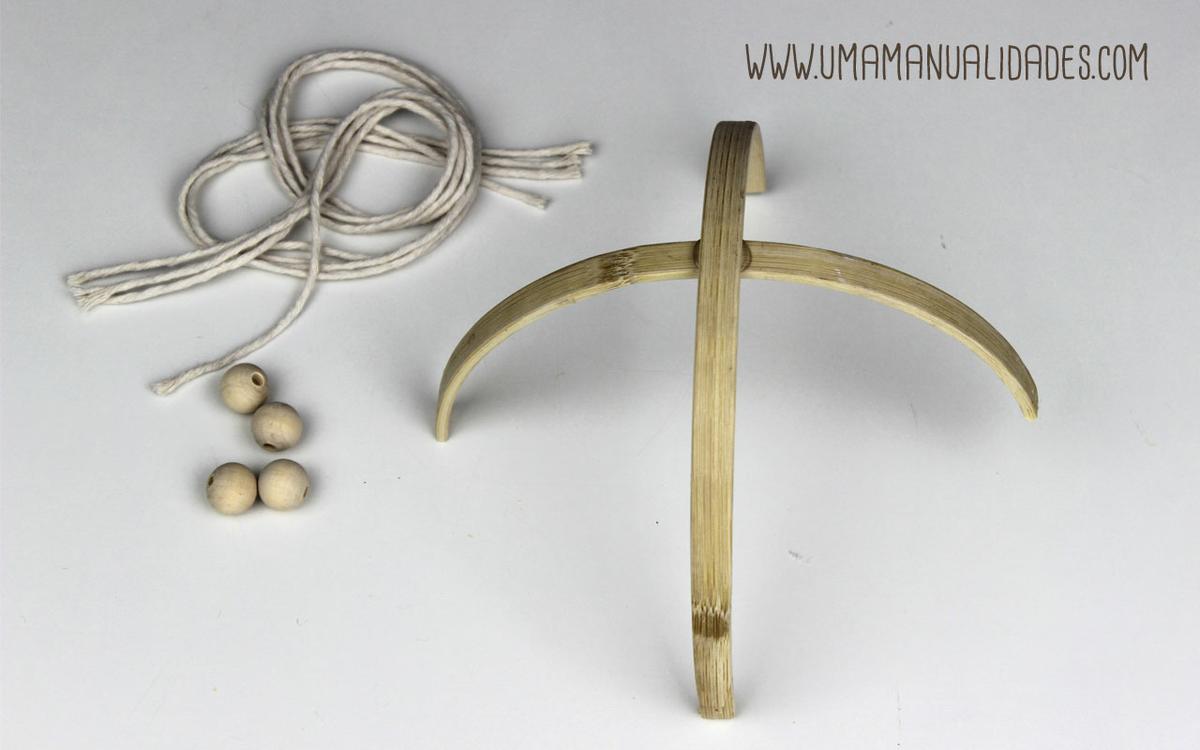Para hacer móviles que situemos sobre la cuna, podemos ayudarnos de la típica estructura de cuerda y madera que podemos hacer con la ayuda de un aro de madera. En éste caso se ha empleado un bastidor y se ha partido por la mitad para colocarlo en forma de cruz. A continuación le colocamos las cuerdas en los extremos y algunos elementos que llamen la atención de nuestros pequeños.