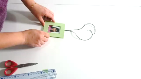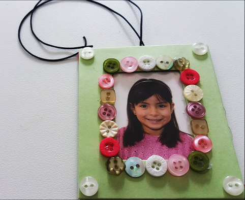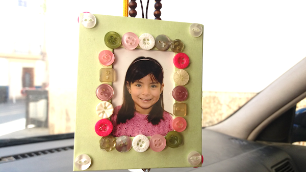 Esto lo forramos, pegamos la foto y encima el acetato pero sólo pondremos un puntito de silicona caliente en cada esquina. También en la parte de arriba ponemos la cuerda o cinta con la que lo vamos a colgar. Tapamos con la parte frontal del portaretrato.