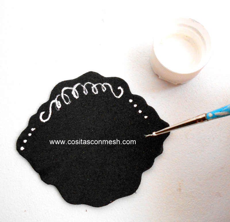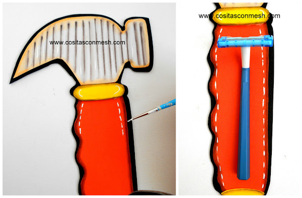 7.-Con pincel linner y pintura blanca, hacemos rayitas en todo el mango del martillo.