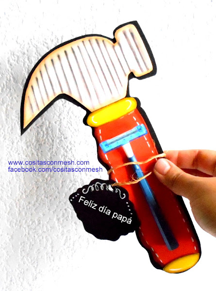 Con un cordoncito de henequén o listón puedes amarrar el regalito ( rastrillo ) que ira pegado en el martillo.