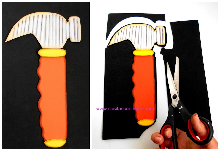 6.-Ahora pegamos el martillo sobre foami negro, y cortamos dejando 5 milimetros de separación.