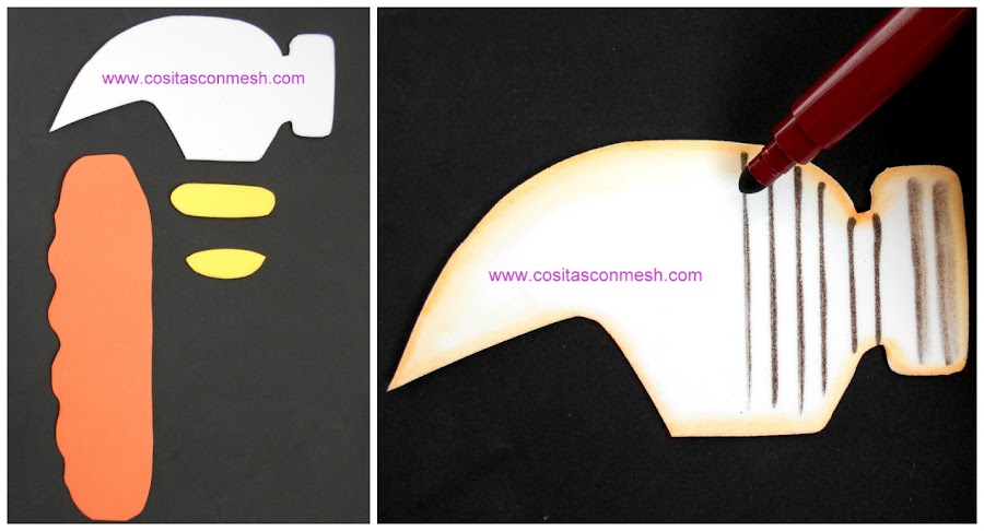 3.-Con plumón naranja, delineo todo el pico del martillo ( foami blanco)