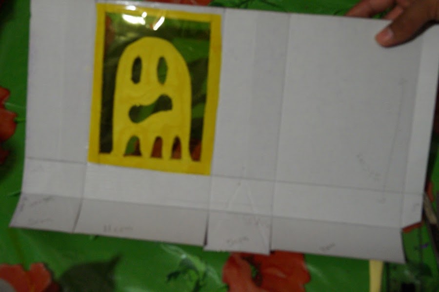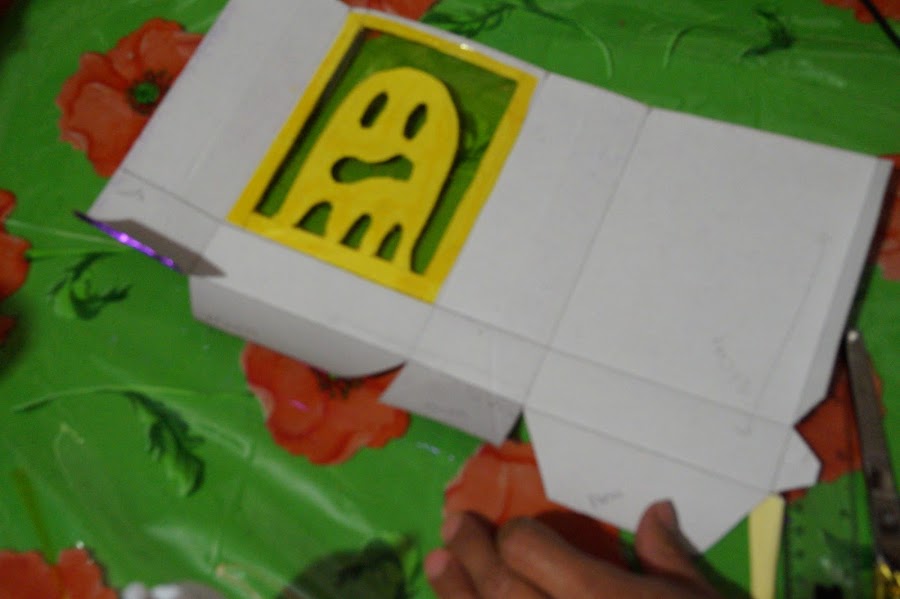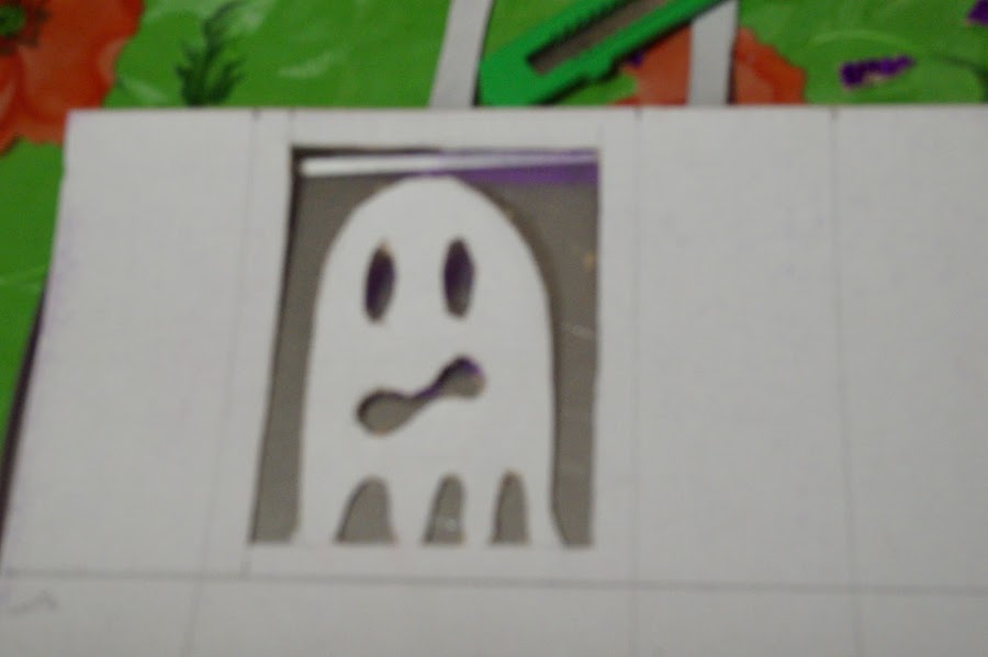 en ese espacio realiza tu diseño, este tiene que estar de algún modo unido a tu rectángulo más grande. Yo realizare un fantasmita, que estará unido por la parte de abajo. Ahora, cómo lo ves en la imagen, el resto del rectángulo donde no está el dibujo será retirado con ayuda de un cutter o exacto.